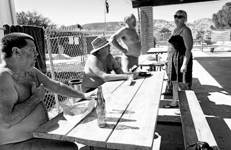I then just walked around the park; there was a bulletin board which posted clothing-optional activities such as hiking, BBQ dinner, Jenga Contest, and several other day and nighttime social gatherings. After shooting for about an hour, Dave took me down to his other property, the Jacumba Hot Springs Spa, which was a bit more tame. There were a few pools and a large Jacuzzi, which had that unmistakable smell of sulfur from the mineral water being pumped into it. There was a friendly bar and restaurant, and everyone seemed to know each other. I walked about a block down into the heart of town which had a small strip of abandoned shops on one side and a Mini-Mart on the other. It felt very desolate.
